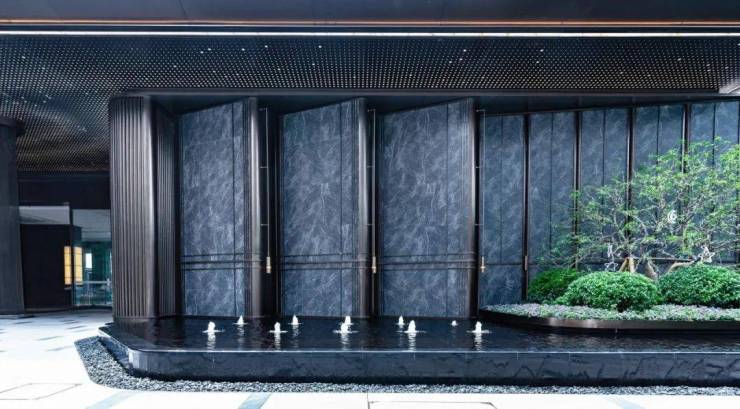 洽谈区入口精心设计,为您呈现核心区景观的极致美景。简洁明快的线条勾勒出整洁优美的场景,绿色植物与水景的巧妙交融、相互衬托,使空间层次更加丰富,营造出别致的光影效果。画面前景为涌泉水面,其上镶嵌精致条形奢石,营造出富有韵律感的美妙画面。