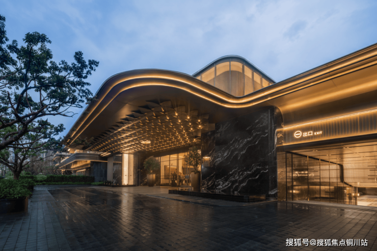 雨篷下,双曲线金属叶片与定制灯具的光晕交织,营造出温暖而轻盈的归家氛围。