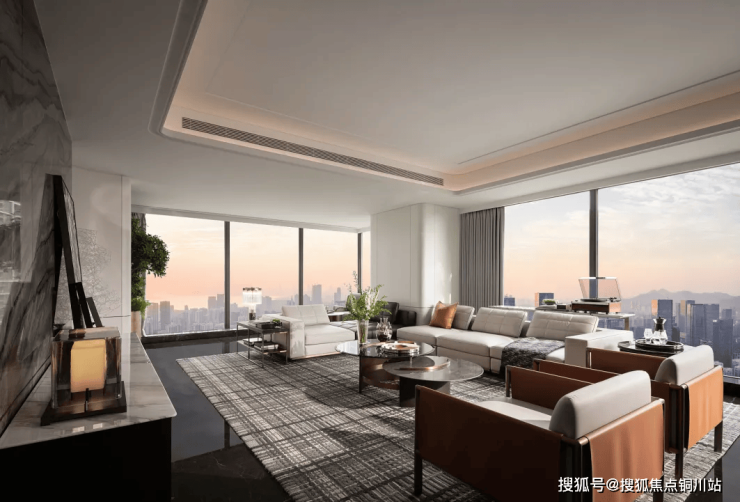 外立面运用国际视野和审美,设置竖向型材线条加强挺拔感,展现长江波光浩荡质感,以大江大河气韵,致敬土地文化。搭配“风帆”塔冠造型,融合鎏金腰线瑞字纹穿孔铝板,成为瑞府藏家身份的专属昭彰。