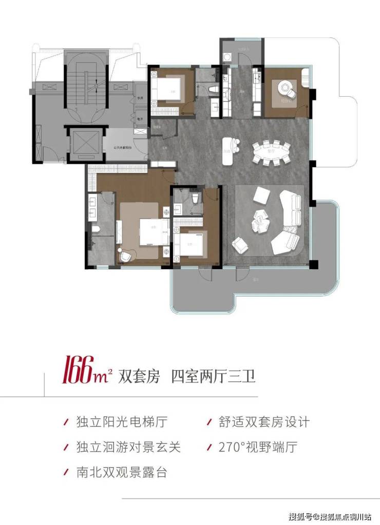 166洋房户型采用双面落地系统门窗设计,270°环幕视野打破传统户型边界;奇偶层错层南北双露台局部放大空间处理,预留丰富生活场景。