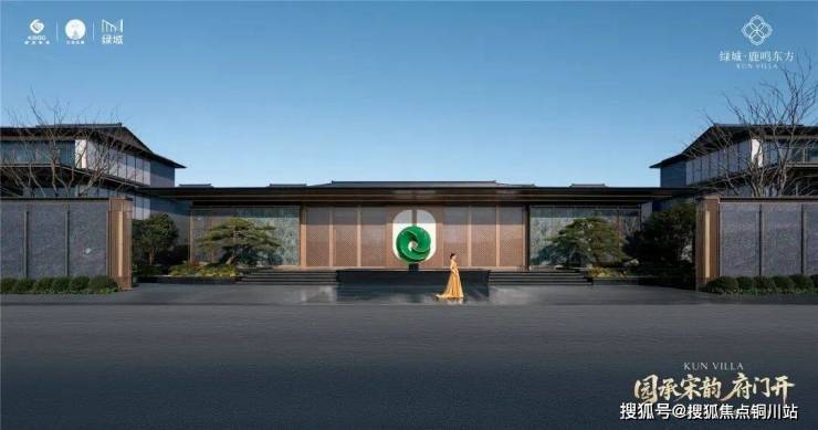 步入正门,一座高度逾40米的宏伟大门巍然矗立。门楣中央镶嵌着圆润对称的团扇造型门饰,其流畅的轮廓线条既构建了归家途中的首重仪式空间,亦寄托着团圆美满的生活寓意。团扇门前,佩环状玉石雕塑静置水畔,取“君子如玉”之意,潺潺流水映衬其间,为场景平添灵动气韵。