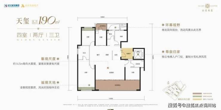 该户型为4号楼仅有户型,南北通透,三开间朝南。带独立电梯前室,南北双阳台,2个飘窗,相较于当下的四代、准四代住宅,优化空间有限,是标准的“四叶草”布局。