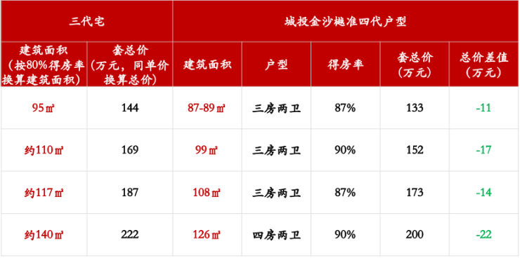 通过对比,与三代宅实得面积相同的情况下,城投金沙樾各个户型的产权证建筑面积要小7-14㎡,若以相同单价换算成总价,从客户角度看,购房支出上可节省11到22万元。