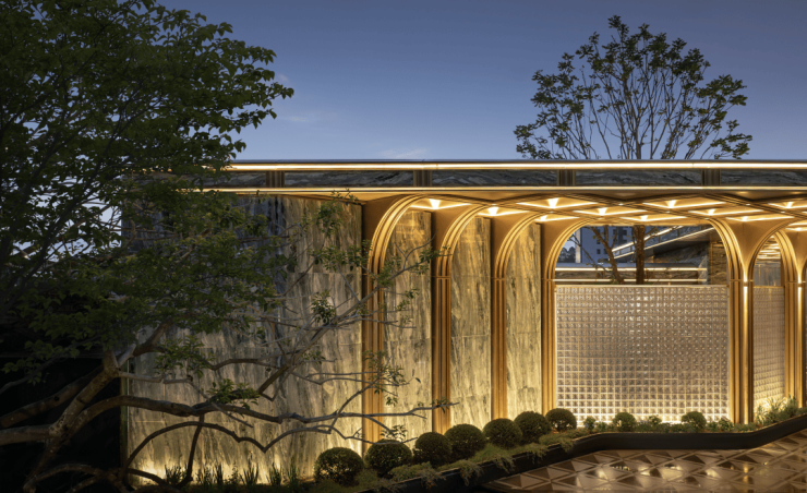 整面幕墙搭配奢石、雕塑去构筑精致感和比例。