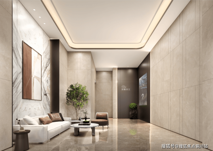 首层入户大堂净高约4.8米,采用天然大理石材满铺,局部还设计了墙体石材饰面、金属屏风造型及艺术吊顶等,呈现出一种星级酒店大堂的气质。