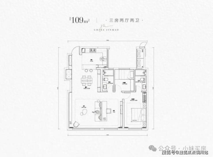 1号楼中间户,进门设置了S墙,增强冰箱收纳;三开间朝南,南向开间约10.9米,客厅开间约7.6米,大横厅get,后续也可以设置个开放式书房,变身3+1房。