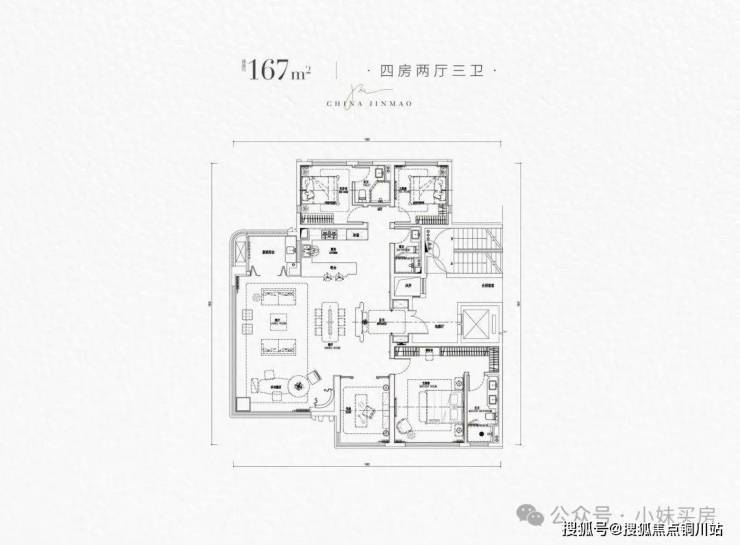 衣物晾晒可以在生活阳台进行,这就让客厅的景观面更加的纯粹,配合大落地窗,使得这个167平户型12米的连幅景观面超级厅得到最大程度落地,居住体验再次拔高。