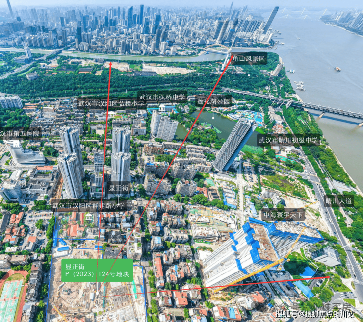 具体来看,项目东面紧挨着的是汉阳老社区,然后是中海寰宇天下·江叁号院,东面不到500米即汉阳江滩,与长江江面直线不到600米;