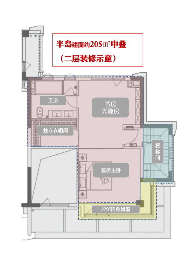 还有近9米的转角阳台,只计算一半的面积,二层270度转角飘窗全赠送……这个建面约205㎡的中叠,实际套内面积可以媲美市面上建面约260㎡的大平层产品。