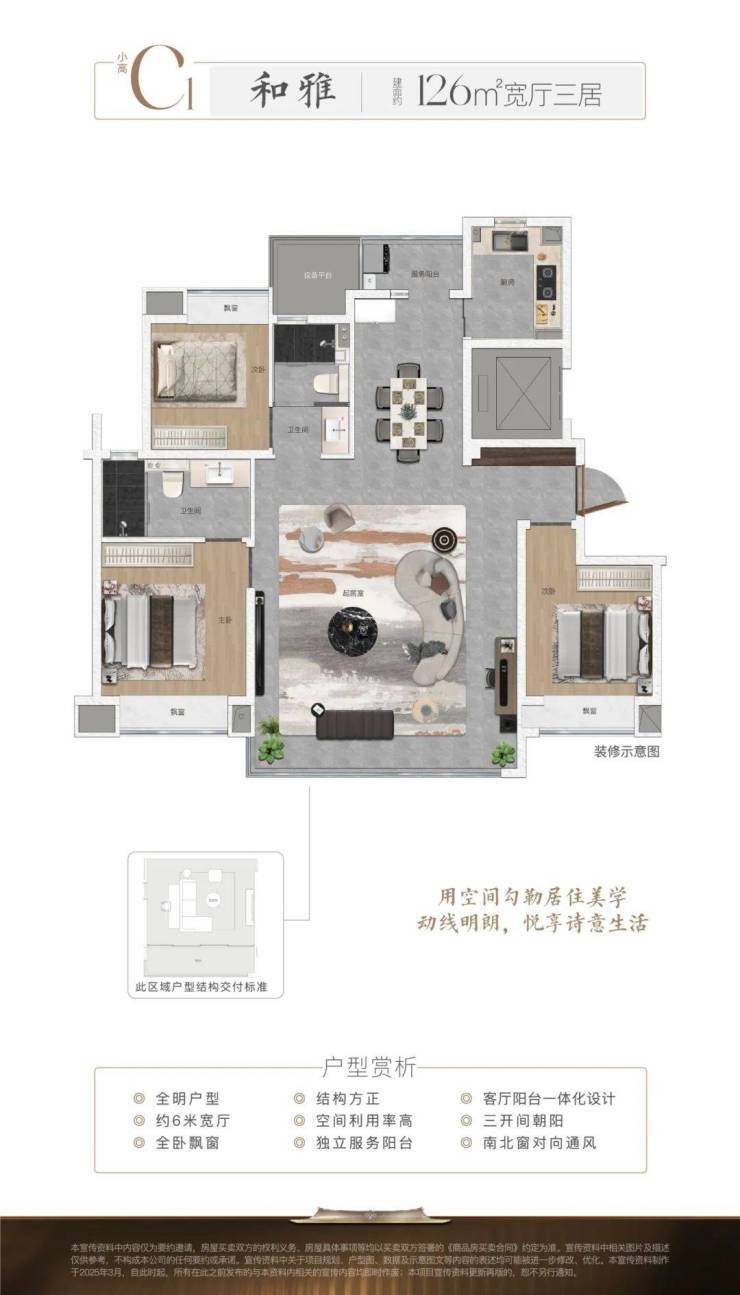 建筑面积约126㎡宽厅三居三开间朝阳保障全天候采光,全卧室标配飘窗延伸休憩尺度。约6米奢阔横厅串联客餐空间,形成流畅生活动线,独立服务阳台兼顾实用与美观。主卧采用套房设计,搭配灵动可变空间(可改四居),满足多场景居住需求。三厅相连格局营造敞阔生活场域,以明朗空间序列诠释现代舒居范本。
