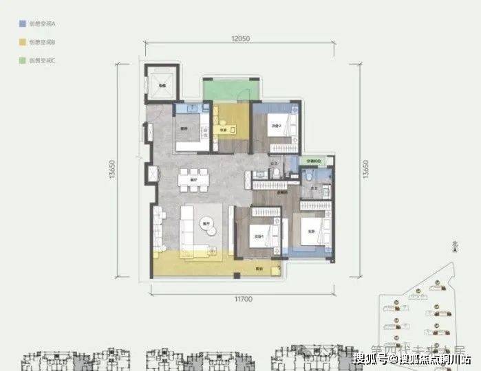 不可思议的是,项目规划计容面积约114平户型做成了标准四房+大横厅。