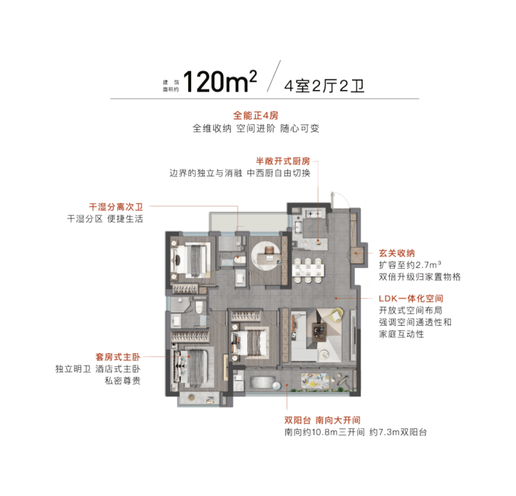 新奢生活观&新奢人居观: 恒温泳池、行政酒廊、活力健身房、漂浮瑜伽室等组成的架空层泛会所,重构了社区社交与健康生活场景;而建面约120㎡正四房“会成长的家”,则以极致的空间格局和生长性,解决了全龄段家庭的核心痛点与情感需求。