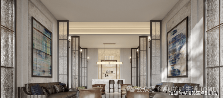 雅集会客厅:意大利洞石墙面流淌月光,茶香与江雾共舞