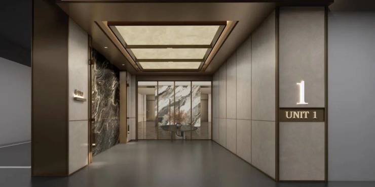 整个尊崇公区从地铺到景墙、从灯光到标识,兼具现代气息下的东方气韵,