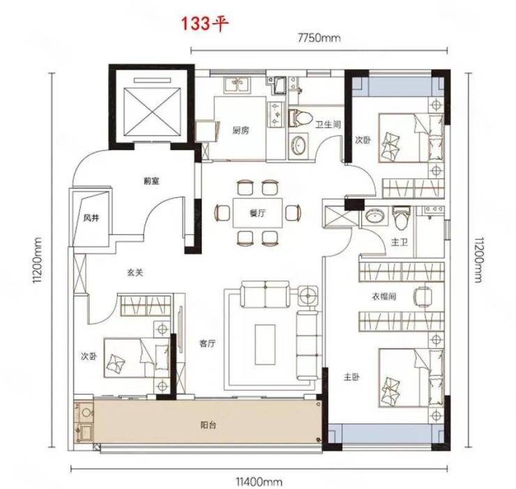 建面约133㎡三房两厅两卫:也是独梯入户,进门还有一个比较宽敞的玄关,整体布局和108㎡的户型非常类似,但是空间更大,南向开间约11.4米,采光会更好,客厅的整体开间也更大更宽敞。
