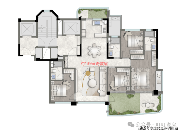 约139㎡四房两厅三卫,一梯一户。