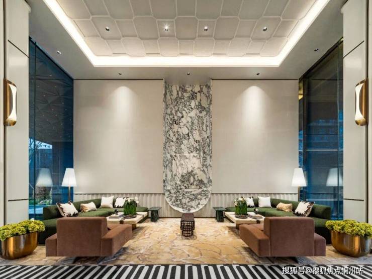 自大门进入,即刻被5米挑高大堂的恢弘气度所包裹。以雅士白为基调,宝格丽紫大理石铺陈出尊贵底色,地面拼花石材衍生出无数精致细节。