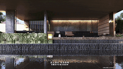 叠水景观水柱自外向内聚集,与两侧造型罗汉松,共同营造出大气典雅与极具尊崇感的前场视觉。