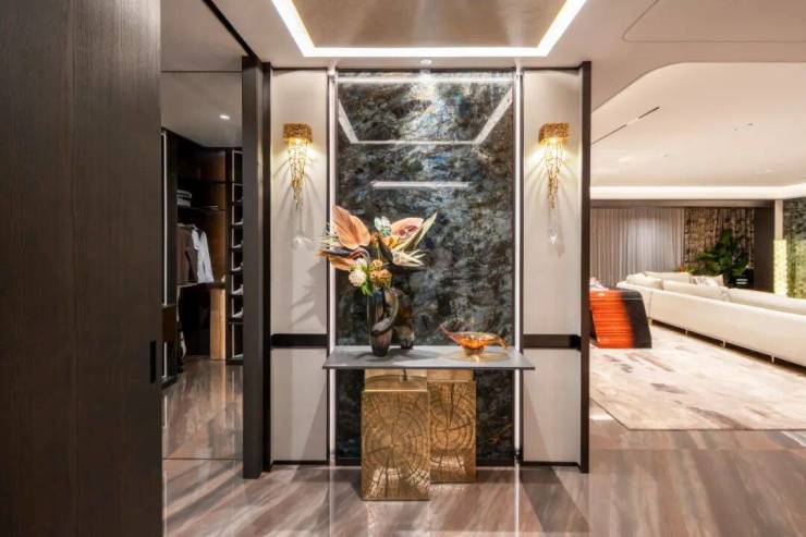 景观示范区核心处,一面水景墙映入眼帘,它采用巴西进口的 “宇宙金” 大理石,底色神秘深邃,独特的金色脉络璀璨奢华,尽显非凡格调。