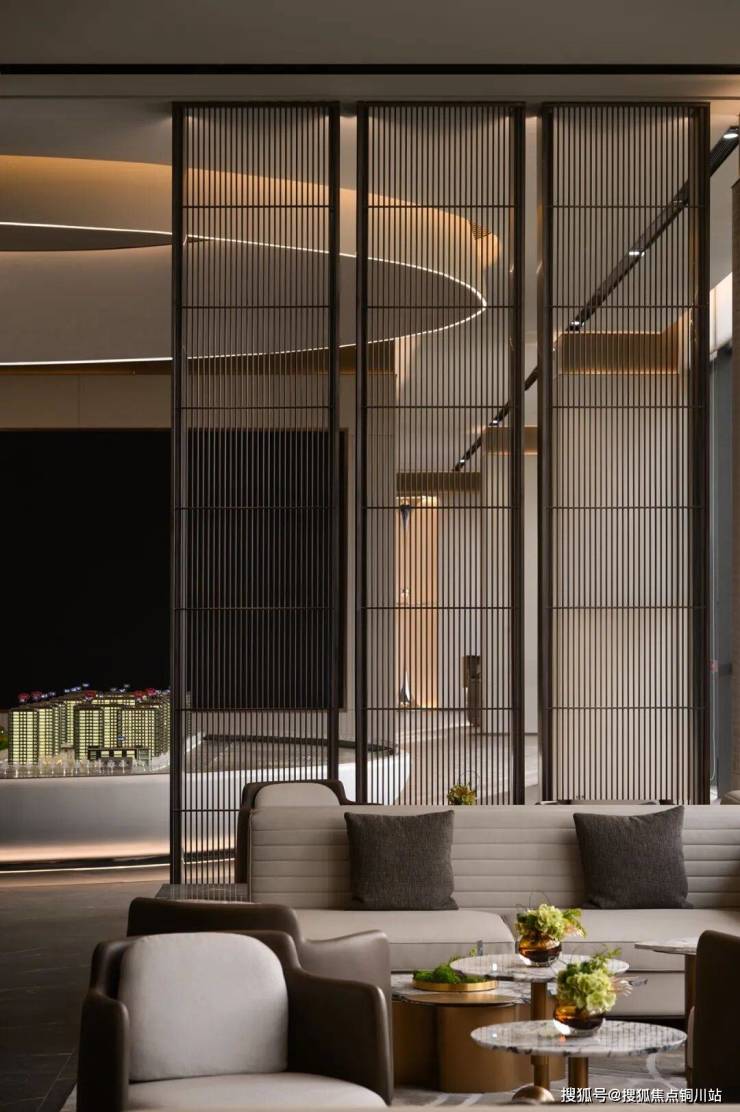 接待区墙面的材质以白沙米黄大理石阵列形成的格栅为主,空间里简洁静谧是基调,雅致悠然是意境,与自然结合呼应本真与自我。又或像随意却苍穹有力的书法,勾勒出雅致而简朴的空间氛围,不禁驻足而停留、思索、探知。
