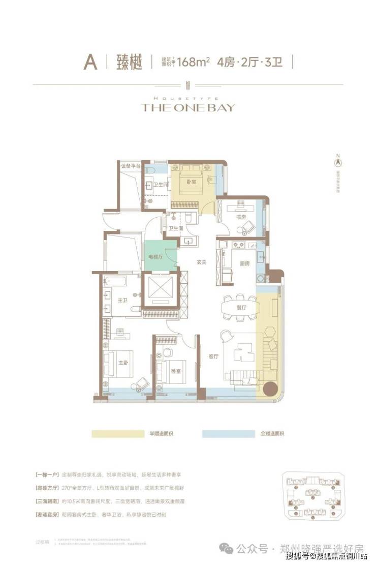 所以臻湾一品的产品全面升级,自然就是迫在眉睫的势在必行,总占地仍然是40亩左右的臻湾一品,在多出了两栋楼的同时,总户数却反而少了300户,起步面积更是吸取教训,上来就是127平起步,而且127的面积段也只有60套左右,剩下9成9的户型,美盛全部做成了143和168两个面积,而且在5.99容积率的情况下,臻湾一品不仅实现了一梯一户的私家电梯厅,也同步把得房率拉高到了95%左右,此外,3000平的架空层和会所,室内专业羽毛球场馆,还有翼展建筑、能量晶幕,270度的转角阳台,60米宽的入户大门,6000平的中心景观设计,这总算是把中环壹号失去的产品力,给全部的补了回来,也让臻湾一品,能真正的得以在金水北的改善舞台上,跟越秀等项目同台竞技!