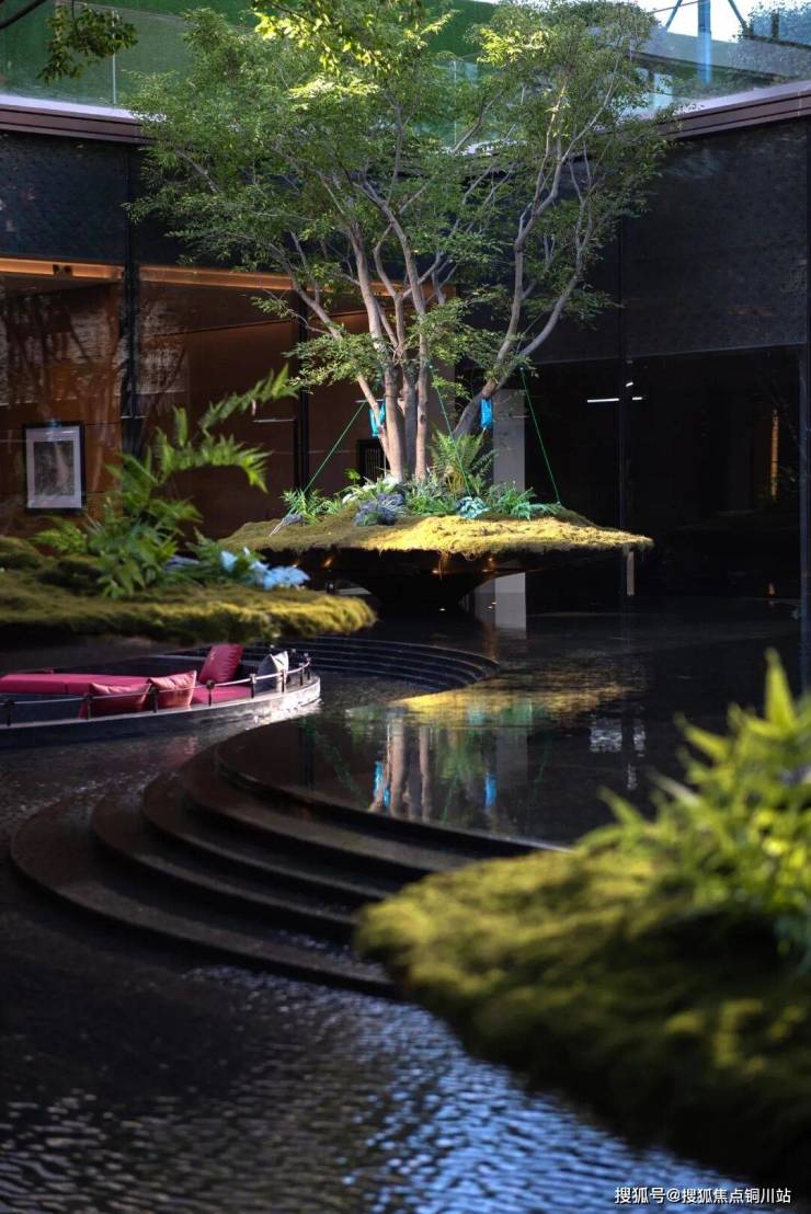 为了兼顾下沉庭院四面纯粹的视野享受,设计有意将水景、树池抬高,将人的感官体验聚焦于被“悬浮自然”包裹的静谧与诗意。植物精选了北方珍贵的小叶菩提树种,场景同时呼应了花苞向上生长的浪漫形态。