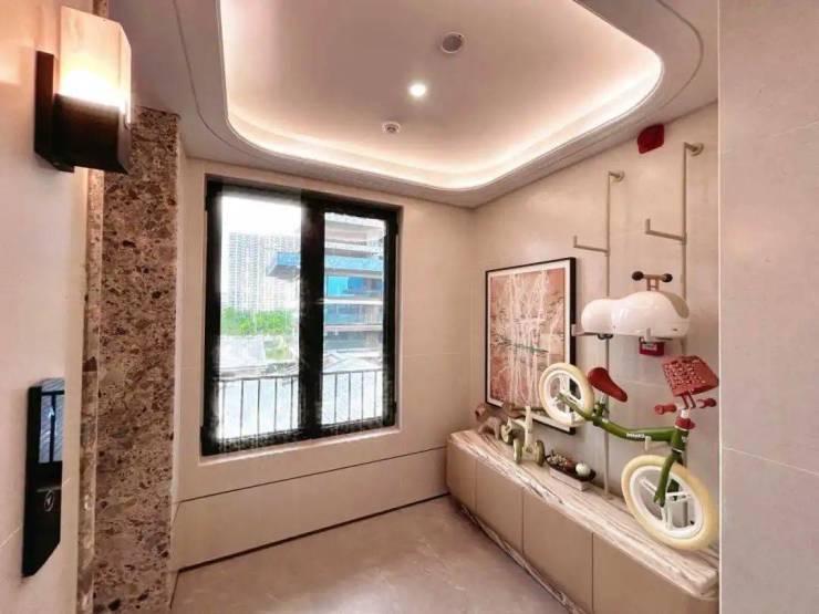 作为隐奢归家的最后一环,私享电梯厅的设计,实现了居者从公区度假到私密独享的空间转化:自然与光影围合起一方光厅私域,与园林四季交相辉映,精致收纳间,让私域的奢感边界在此无限舒展。
