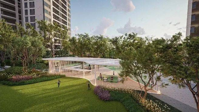 规划了森林会客厅、森之秘境、悦动氧吧等不同功能景观区,绿地率约40%,是项目绿地率Z高的地块,仅约300户共享一个约13185㎡的中心园林!