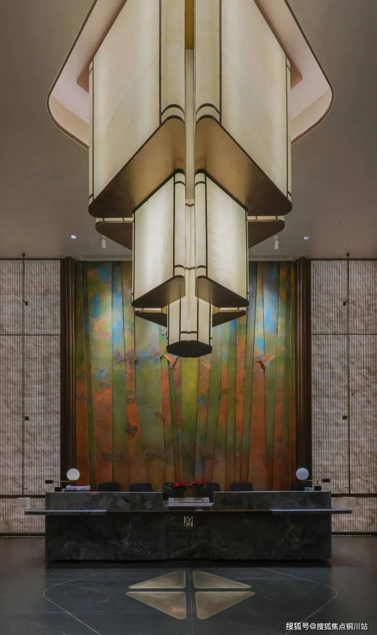 归家大堂,硕大的吊灯,率先抢占视觉焦点,正对面的景墙,天然奢石,用色大胆,不规则的拼接造型,极具艺术感。