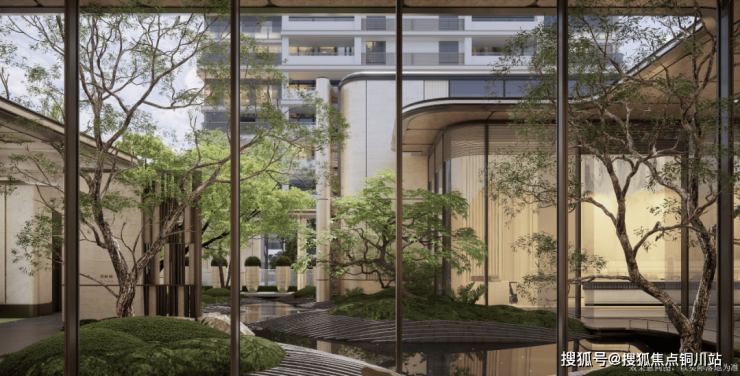 其中,涛影流金·下沉式庭院,撷取黄河第一湾之“形”,一座石桥静卧清波之上,叠瀑循阶而下,流水淙淙,庭中每株乌桕独立成景,让业主收获归家如入园的感受。