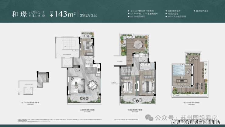 约143㎡上叠,3房3卫,约7.4m开间,270°全景舱横厅,约6.2m挑空客厅,屋顶层赠送大露台!