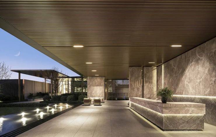 廊架前设计有镜面水景,倒映整个廊架,旁边还布置软装,未来业主可以这在这感受潺潺水波。