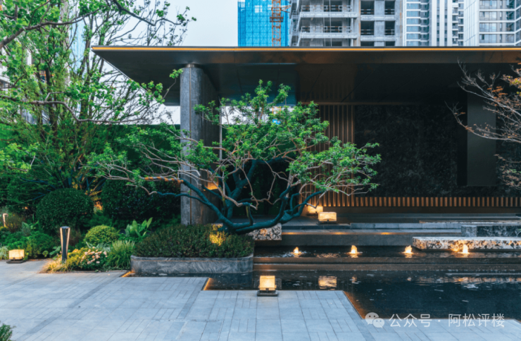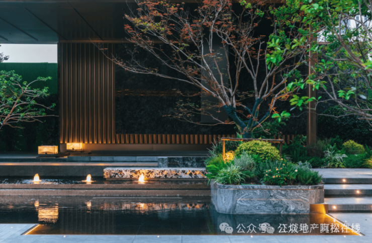 社区内,有大量水景,与绿植、地灯等搭配辉映。