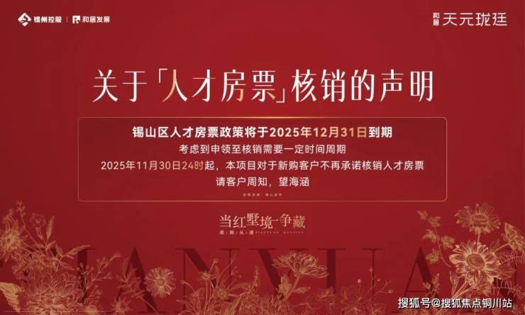 根据现有发布的政策,锡山区人才房票补贴将于2025年12月31日全面截止。为保障客户具备充足的申领与核销周期,项目正式明确:2025年11月30日24时起,本项目对于新购客户不再承诺核销人才房票。当前正值政策关窗前最后机遇,是人才安家与优质资产配置的双重良机会。