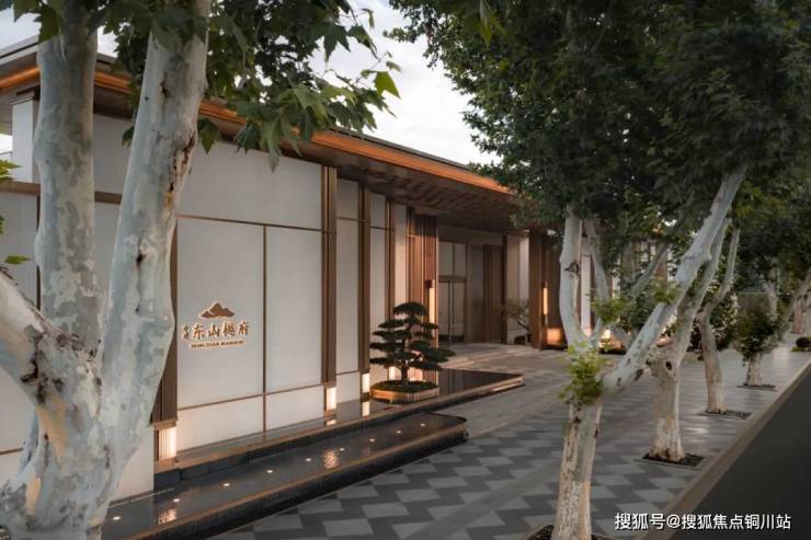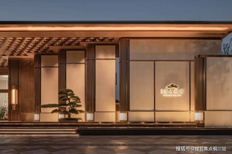 入口门头景墙,提取了南京中式门扇元素进行演绎,传承中国礼序文化,打造殿堂级的高定城市形象界面。90米恢弘的城市界面徐徐展开,入口特选名贵造型罗汉松,斜飘造型,苍劲挺拔的身姿,结合对称仪式感水景涌泉,彰显着不凡的尊荣气度。