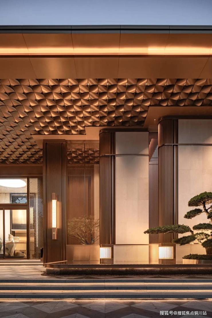 景观材料选用天然奢石:沉香米黄大理石,艺术金属现代质感与天然奢石的温润肌理碰撞出奢华韵味。结合大尺度门头界面,采用经典对称布局形式,整体高度控制在8.9米,打造皇家礼序归家气质,宛若一张精心雕琢的城市名片。