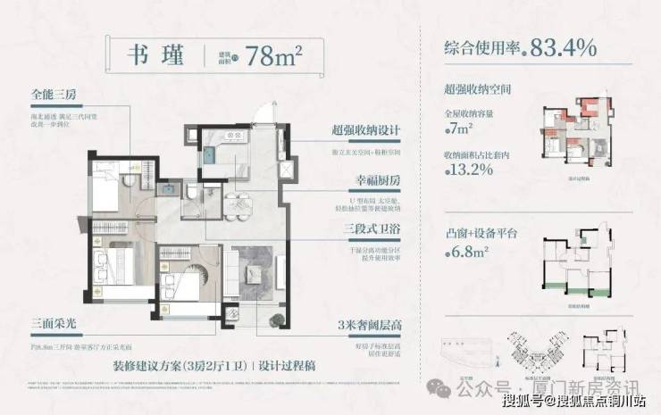 建发·书香云锦78㎡户型综合得房率高达83.4%,空间高效利用,打破了刚需对上车产品的刻板印象。不计产权面积约6.8㎡,相当于多送了一间小书房或储物间,妥妥的白捡的大便宜。而且该户型还做到户户边套,南北通透,卧室并非普通产品的采光井采光,而是正常的开窗面采光,真正做到刚需产品改善的品质。