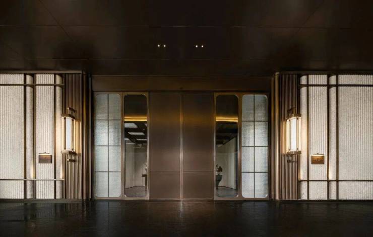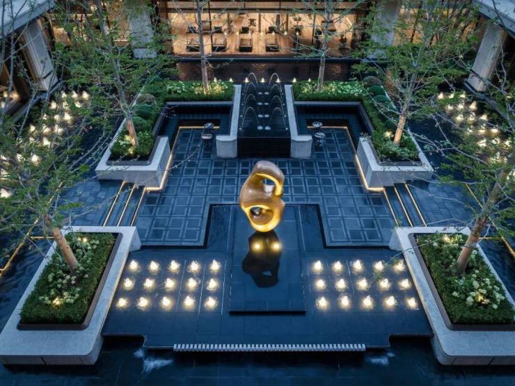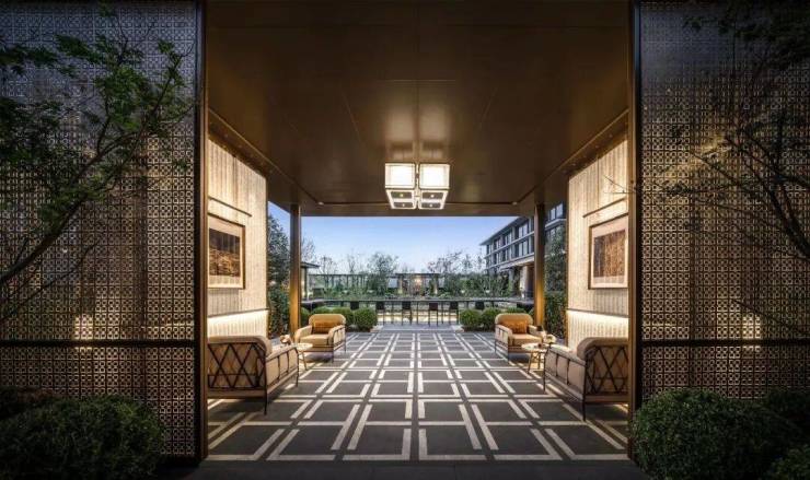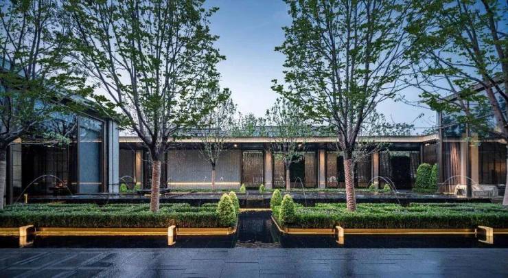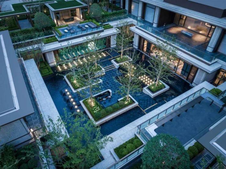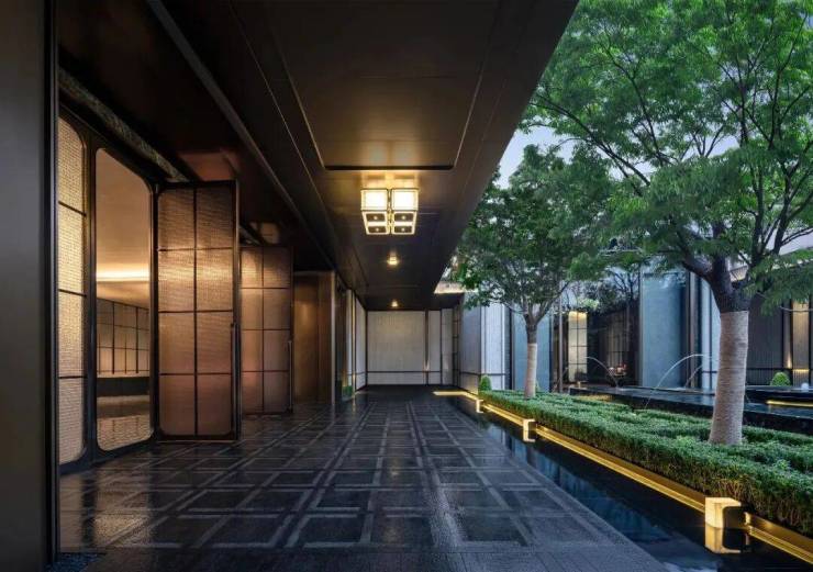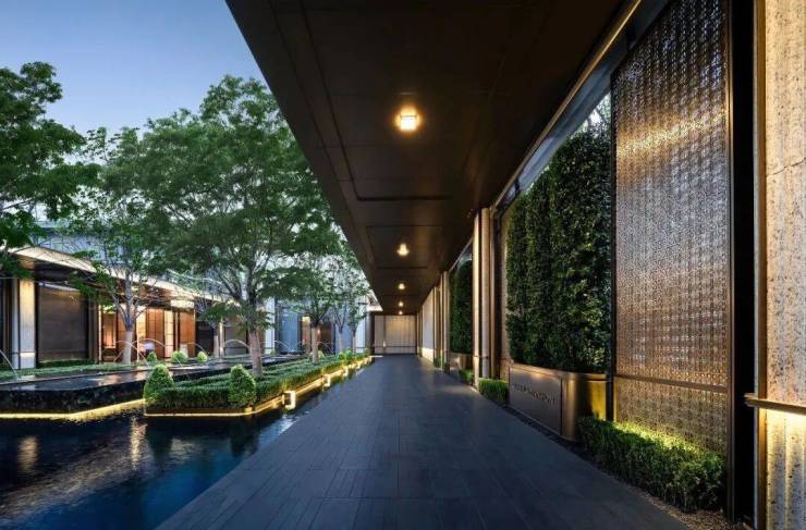 门口是很有对称仪式感的车马院,进门是高度对称的长廊水院,围绕着地面归家大堂展开的架空层、亭廊,以及围绕着下沉式庭院展开的会所空间,同样讲究「中轴对称」。