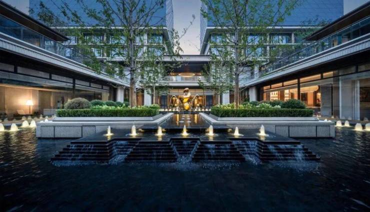 窗外又是高度对称的长廊水院。喷泉与长廊,给你对称仪式感;水光树影,给你静谧;玉石柱式与金属格栅,给你典雅。他们把准宝石级别的「蓝翡翠」奢石,铺装在水底,它有一个很美的名字,叫做「银河的眼泪」;阳光会把池底的那抹蓝色,反射到你的眼底。