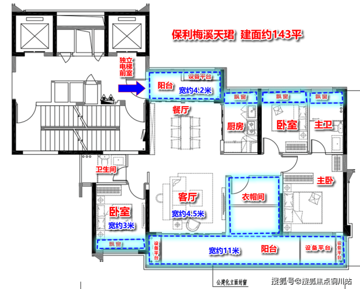 ●推出建面约143㎡爆款户型,近100%得房率;私享电梯前厅,营造出"一梯一户"的尊贵体验;四开间朝南,约14.85米大面宽;双阳台格局,南北对流;全明卫设计,无暗角阳光生活;全屋设计4个飘窗、4个设备平台,进一步增加使用面积。