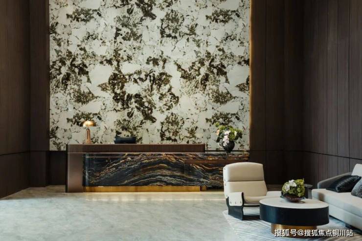 外立面即封面。社区大门的 “ 爱马仕灰 ” 石材,搭配流光溢彩的香槟金铝板,走近即有 “ 归家即高光 ” 的仪式感;步入大堂,大面积的 “ 雪山银狐 ” 大板岩板背景墙,单元入户大堂前的拼花工艺铺装,每处的选材与细节都透露着用心与讲究。