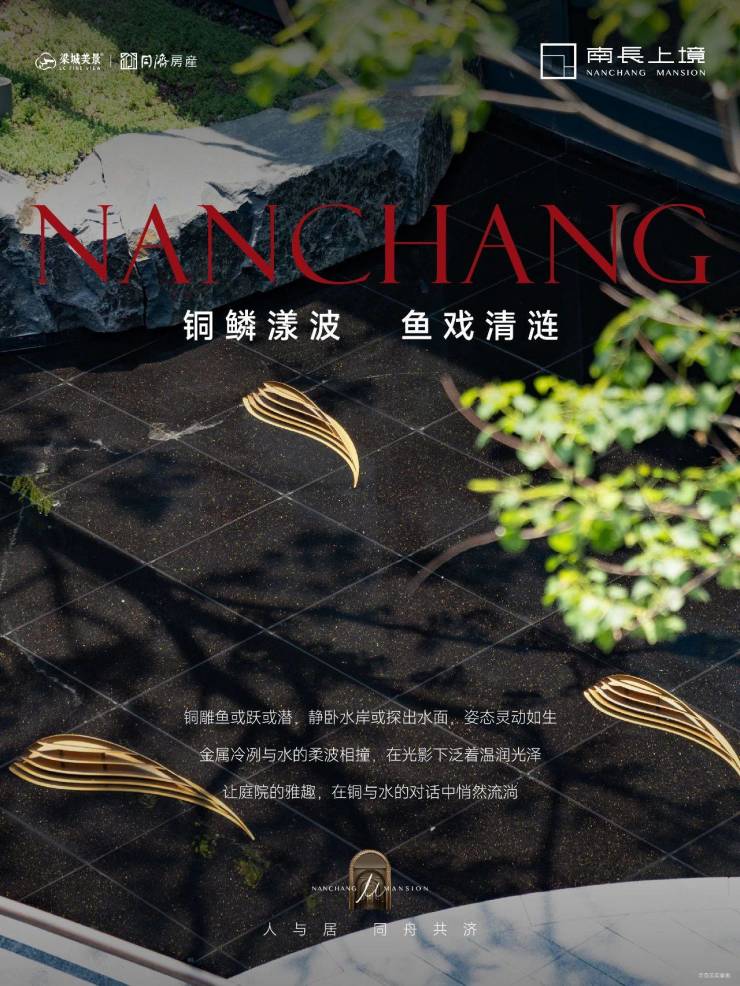 铜雕鱼半浸在水里,鳞片闪耀,似从江里跃来