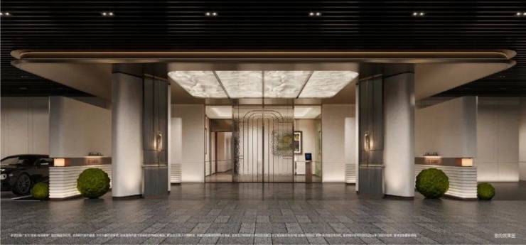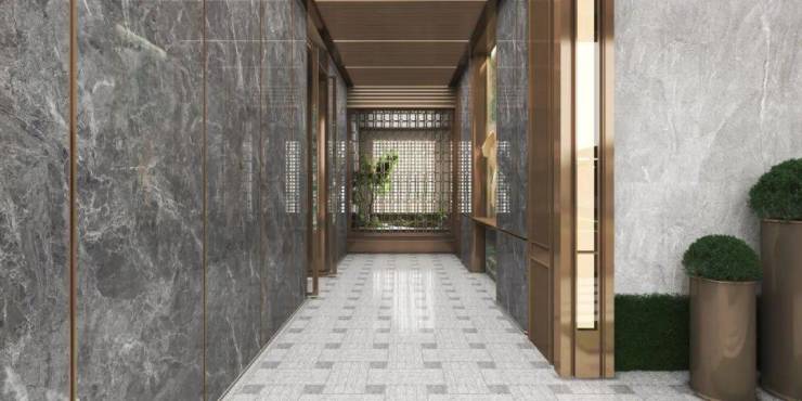 架空层、楼栋大堂、甚至是过道景墙,精致的奢石和琉璃的铺贴。