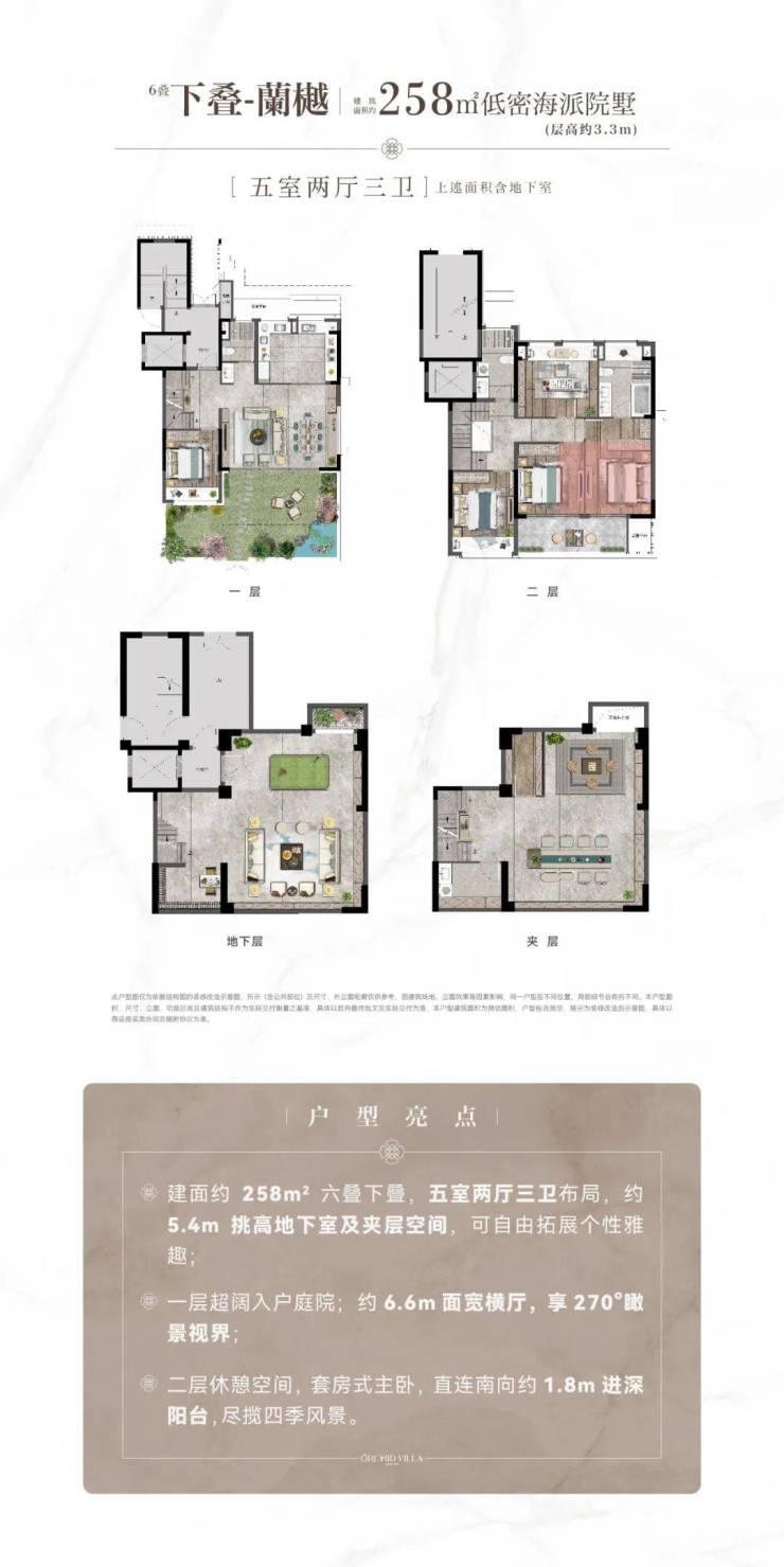 项目超大挑空设计与宽阔阳台,赋予居住空间更高的使用率与仪式感。客厅局部约6.6m挑空设计,下跃地下室挑高约5.4m+夹层,超高层高:洋房约3.15m、叠墅约3.3m,可自由拓展个性化空间。