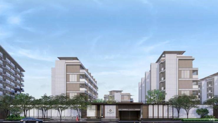 洛兰府的设计灵感源于海派建筑的经典元素,立面融入石库门、弄堂石拱门的弧美,采用香槟色金属、灰白色石材一体板等高级建材,方圆结合的造型彰显高颜值海派美学。项目还融入传统文化的“九处五”设计理念,通过约45m宽气派大门、“五福出水”涌泉水景、榉树置景、屏风景墙等元素,营造尊崇的归家礼序。