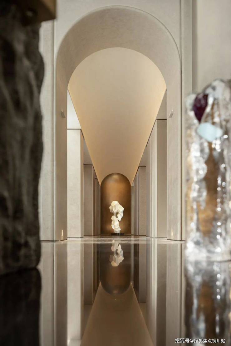 步入负一层艺术前厅,曲面的穹顶与首层星空顶遥相呼应,仿若一场光影的诗意对话。设计灵感源自丰岛美术馆的流动美学,以柔和的弧线勾勒出静谧而深邃的空间。
