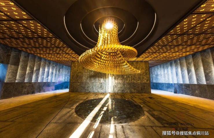 来到景墙的背面,头顶之上,仿古穹顶以优雅的弧线延展开来,这时候有光从酒樽透过来,酒樽倒影照射到这个像吊灯一样的装置上,地面的绿松玉石透出绿玉般的肌理,这个“倒景台”设计不仅有独特的视觉效果,更是形成天地一体的意境交融。