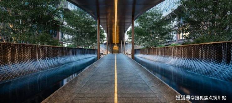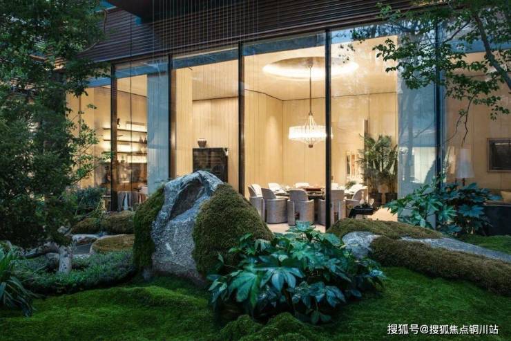 幂翠庭,取意嵩山幽谷的苍翠叠嶂,以自然山石为骨、原生苔藓为韵,树木恣意生长,力求还原最原始的山林野趣。金茂为此专门从太行山脉移植过来7棵迎客松,配以石台、置石等,再加上10m高的流水线瀑,打造出二水夹明镜的下沉水院。