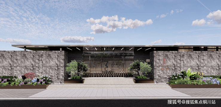 走近来看,约40m星级酒店式社区实景主大门,精选一整面别墅园林专用天然开山石料。高约6m的艺术化景墙,融入风铃幕墙元素,优雅金与高级灰巧妙结合,十分气派。