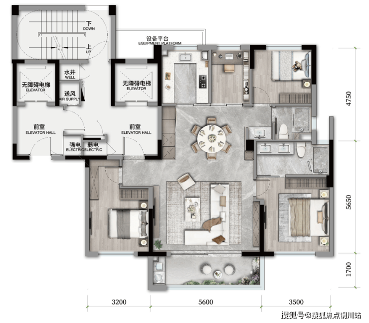 值得一提的是,这个户型并没有过分拉伸客厅开间,而是把尺寸均匀分配给南向双套房,使它们的开间分别达到约3.9米和约3.65 米,奢侈又贴心,与父母或者子女同住,完全能满足各自独立的生活需求。